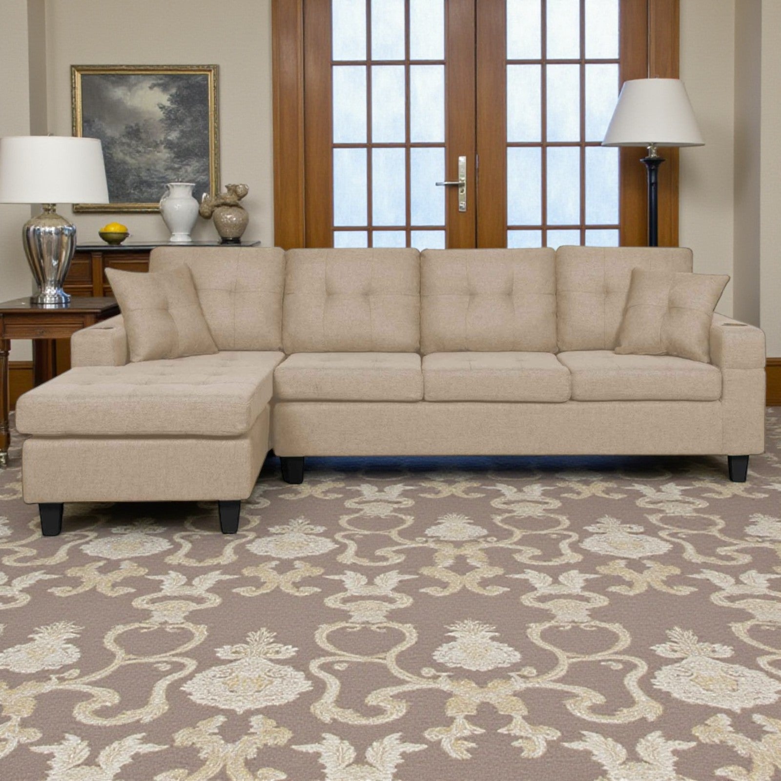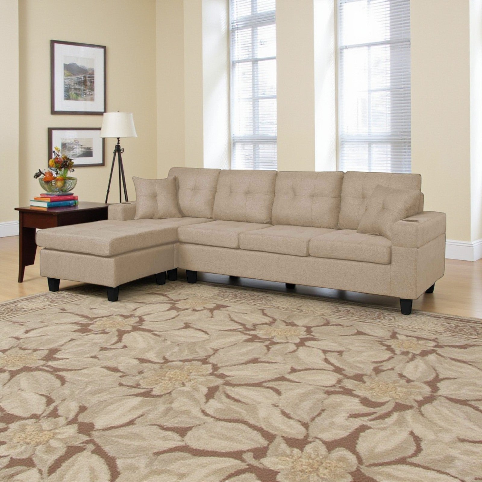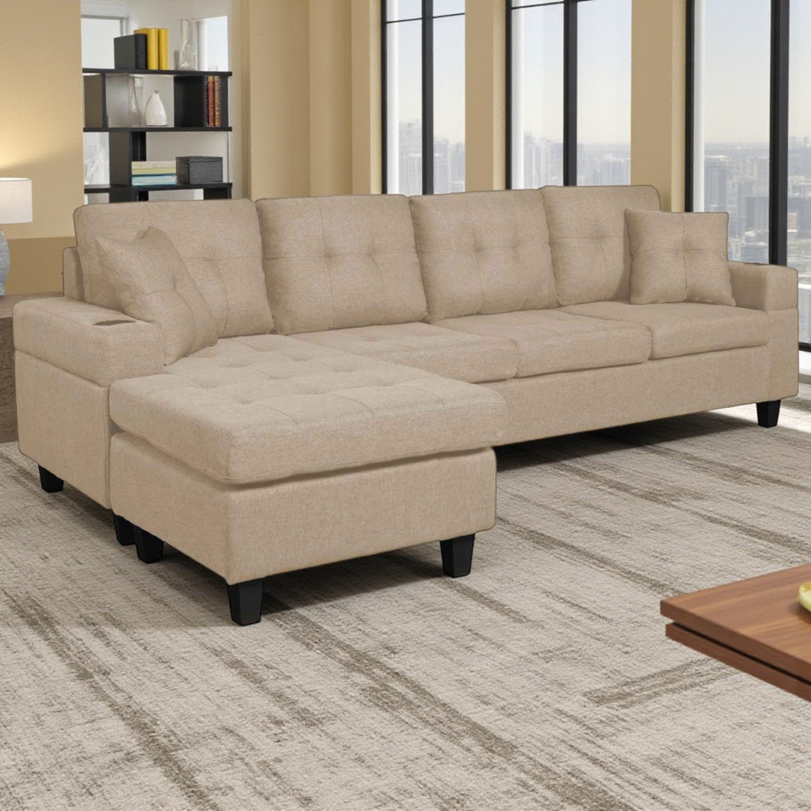 Coral Sectional Sofa in Fabric Upholstery With Reversible Chaise & Cup Holders - Beige