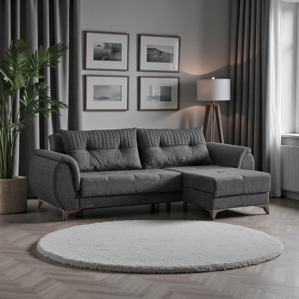 โจ Graceful Design: Modern style with curved pleated armrests, button-tufted back, channel-tufted side panels, L-shaped configuration and appealing dark grey finish.