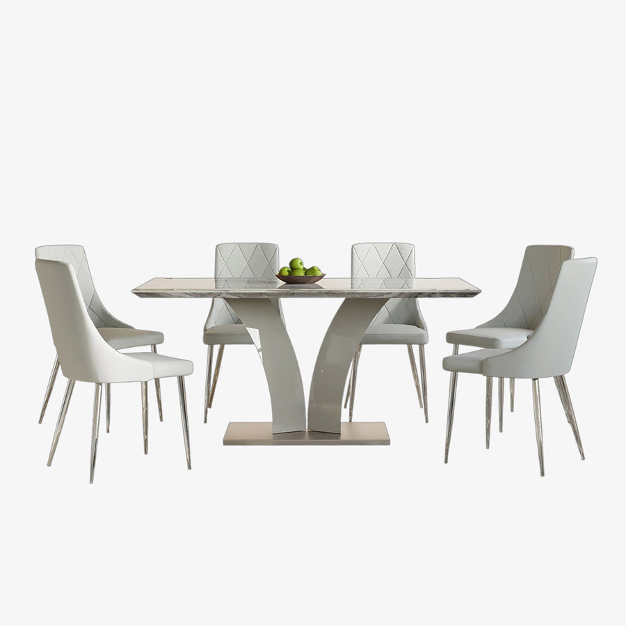 Introducing Sonnet Dining Table Set, a sophisticated and durable addition to your dining space. Set includes 1 dining table and 6 chairs, ideal for family gatherings.
